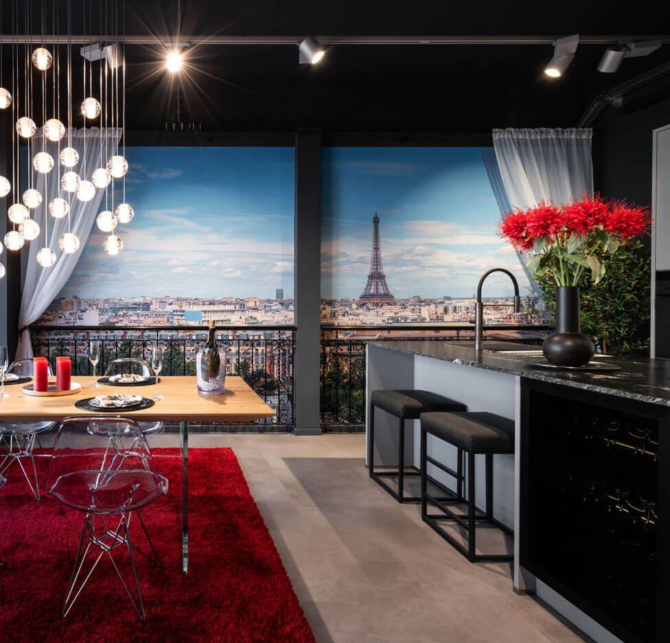 Die Tapete mit dem Blick über Paris rundet das Ambiente ab und schafft eine Kulisse, die von Freiheit und Eleganz erzählt. Hier wird jede Mahlzeit zu einem besonderen Erlebnis, inspiriert von der Stadt der Lichter.